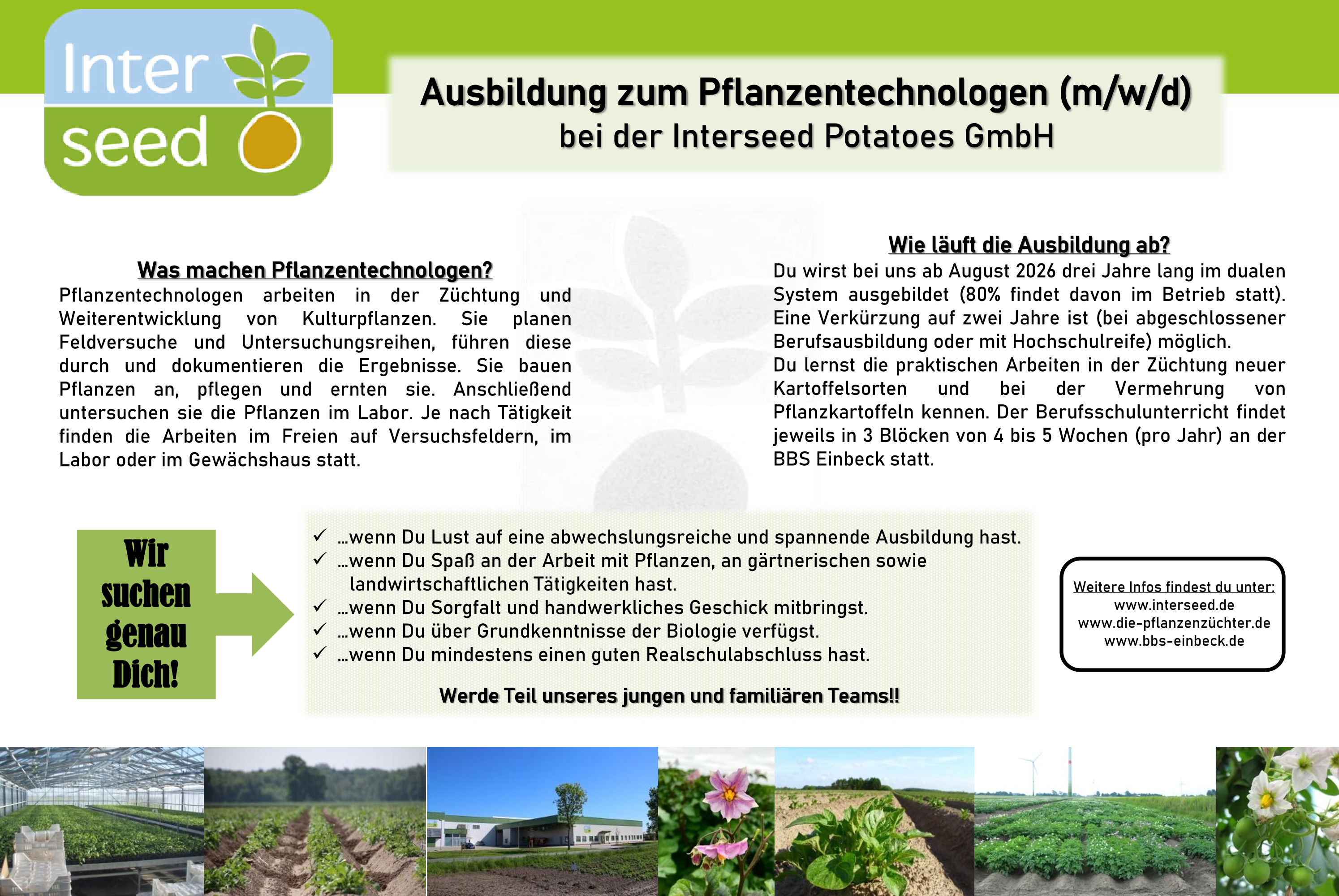 Die Interseed Potatoes GmbH ist seit über 25 Jahren in der Züchtung und Vermehrung hochwertiger Kartoffeln zuhause – und weltweit mit starken Partnern vernetzt. Jetzt suchen wir motivierte Nachwuchstalente, die gemeinsam mit uns die Zukunft der Landwirtschaft gestalten wollen. Bei uns bekommst du eine praxisnahe Ausbildung, moderne Arbeitsumgebungen und die Chance, von echten Profis zu lernen. Starte mit uns in dein Berufsleben und entdecke, wie vielseitig und spannend die Welt der Pflanzkartoffeln sein kann!